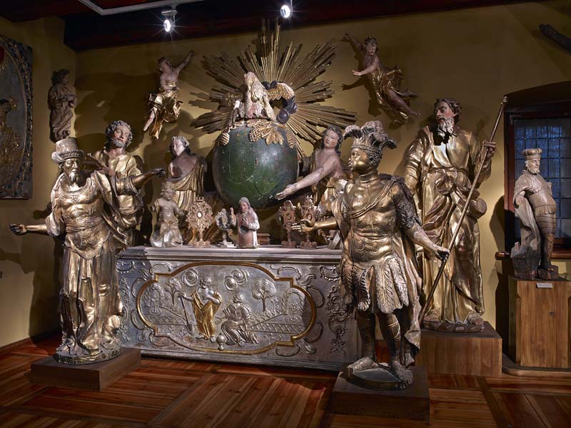 Muzeum posiada również liczne przykłady drewnianych rzeźb oraz fragmenty architektoniczno-ornamentalne dawnych ołtarzy. Są zróżnicowane pod względem stylistycznym i artystycznym, choć przynależą głównie do nurtu rzeźby małopolskiej. Na zgromadzonych w Muzeum przykładach prześledzić możemy przemiany średniowiecznej, barokowej i rokokowej rzeźby europejskiej (m.in. rzeźby Tomasza Huttera i Macieja Polejowskiego).