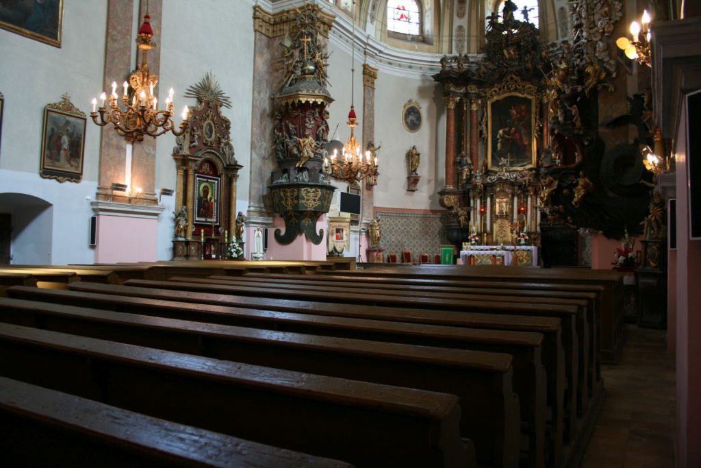 - Polichromie i freski: Sklepienia i ściany kościoła często pokrywają piękne malowidła iluzjonistyczne, które optycznie powiększają przestrzeń i opowiadają biblijne historie.