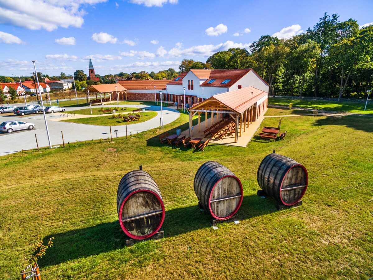 Sala degustacyjna: Przestrzeń, w której turyści mogą spróbować win od różnych lokalnych producentów, poznając różnice między poszczególnymi szczepami (m.in. Riesling, Solaris, Pinot Noir czy Regent).