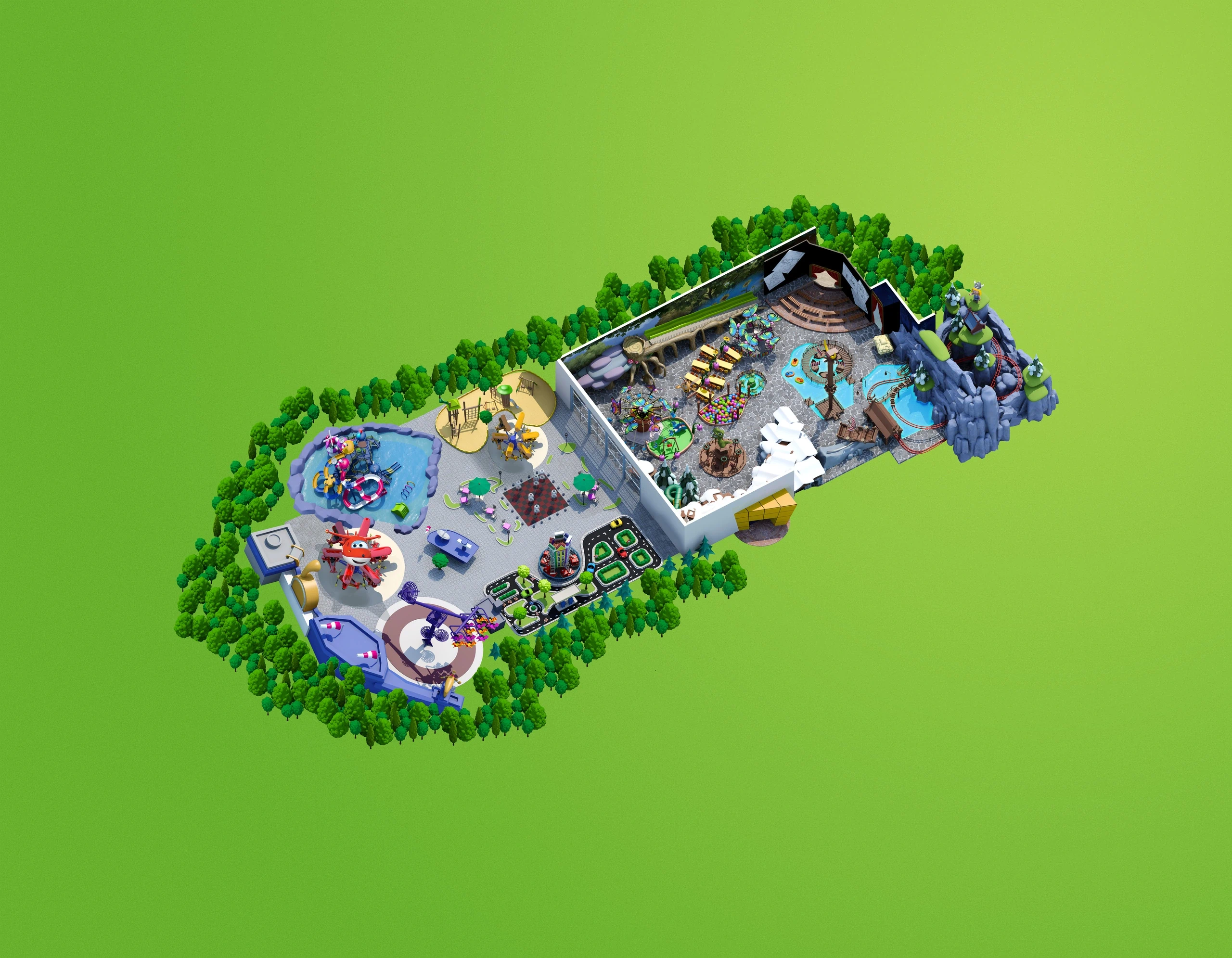 Cały park został podzielony na strefy tematyczne, w których królują postacie znane z popularnych animacji. Najmłodsi mogą odwiedzić świat Pszczółki Mai, wziąć udział w przygodach z dzielnym Wikingiem Wickiem czy przenieść się do futurystycznej strefy Super Wings. Bajkowa scenografia, pełna kolorów i detali, sprawia, że odwiedzający czują się jak wewnątrz animowanego filmu.