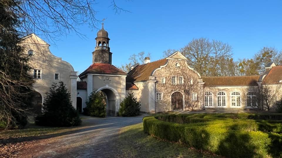 Kompleks obejmuje dwukondygnacyjny pałac z wewnętrznym dziedzińcem, otoczony fosą, a także rozległy folwark z zabytkowymi budynkami gospodarczymi, takimi jak spichlerz, stajnie, gołębnik i malownicza brama wjazdowa z zegarem. Wszystko to tworzy spójny i historyczny obraz dawnej posiadłości ziemskiej.
