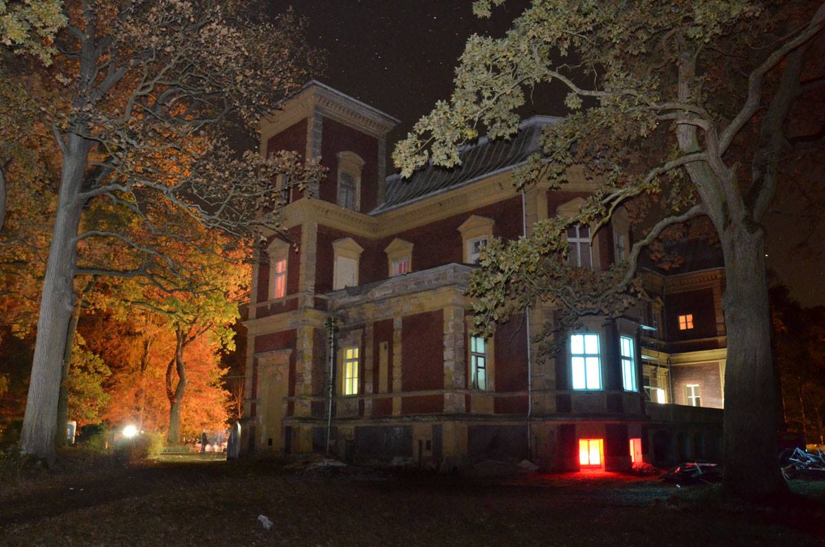 Otoczenie Pałac otacza rozległy park krajobrazowy, który płynnie łączy się z lasami Puszczy Wkrzańskiej. W bliskim sąsiedztwie znajduje się również zabytkowy, ryglowy kościół pw. św. Huberta oraz pozostałości dawnego cmentarza rodowego, co tworzy wyjątkowy kompleks historyczno-przyrodniczy.