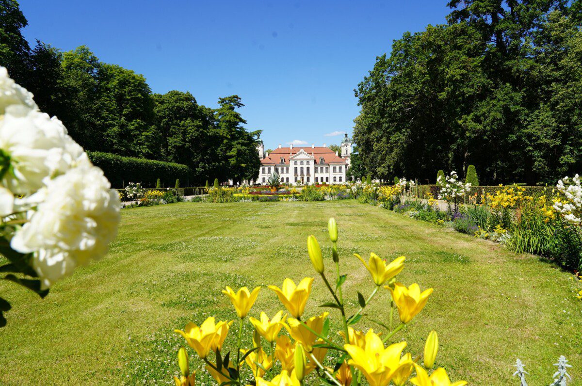 Pałac otoczony jest pięknym, rozległym parkiem, który harmonijnie łączy elementy francuskiego ogrodu geometrycznego (w pobliżu pałacu) z romantycznym parkiem krajobrazowym w stylu angielskim. W parku znajdują się malownicze stawy, liczne gatunki drzew, rzeźby, a także unikatowy, jeden z największych w Europie, grabowy labirynt. Dodatkowo, na terenie zespołu pałacowego zachowała się neobarokowa kaplica pałacowa, powozownia, oranżeria i inne zabudowania gospodarcze.