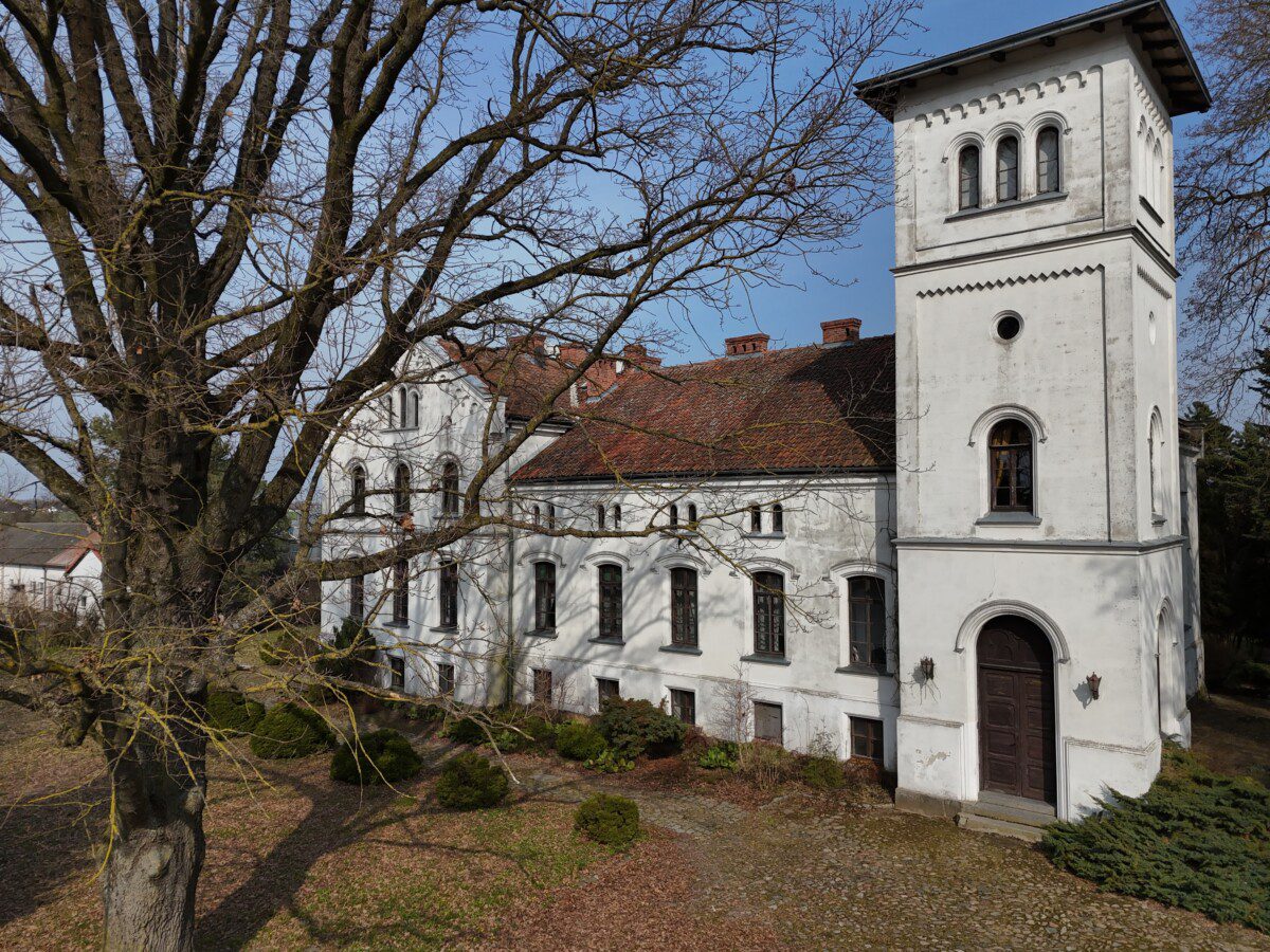 Rezydencja została wzniesiona w 1861 roku, co dumnie przypomina data umieszczona na jej fasadzie. Architektura pałacu łączy w sobie klasyczne proporcje z elementami nawiązującymi do stylu neogotyckiego i eklektyzmu, charakterystycznego dla dawnych pruskich siedzib arystokratycznych z drugiej połowy XIX wieku. Z dbałością o detale zaprojektowano tu reprezentacyjne wejście, zdobione gzymsy oraz smukłe okna, które nadają masywnej budowli niezwykłej lekkości. Przez dziesięciolecia majątek tętnił życiem jako centrum rozległych dóbr ziemskich, będąc milczącym świadkiem wielu zawirowań historycznych, które przetoczyły się przez te pograniczne tereny.