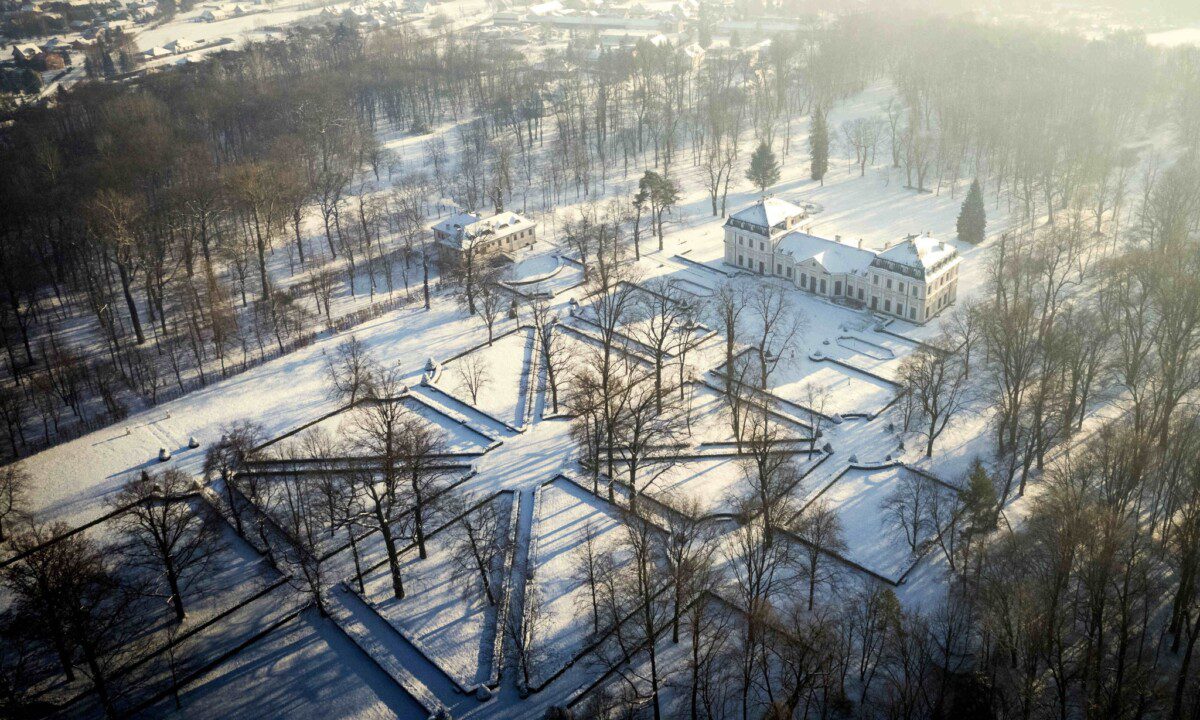 • Park i Otoczenie: Pałac otacza imponujący, ponad 20-hektarowy park, w którym harmonijnie łączą się ogrody w stylu włoskim i angielskim. Na jego terenie znajdują się zabytkowe oficyny, kordegardy oraz urokliwe aleje lipowe i dębowe.