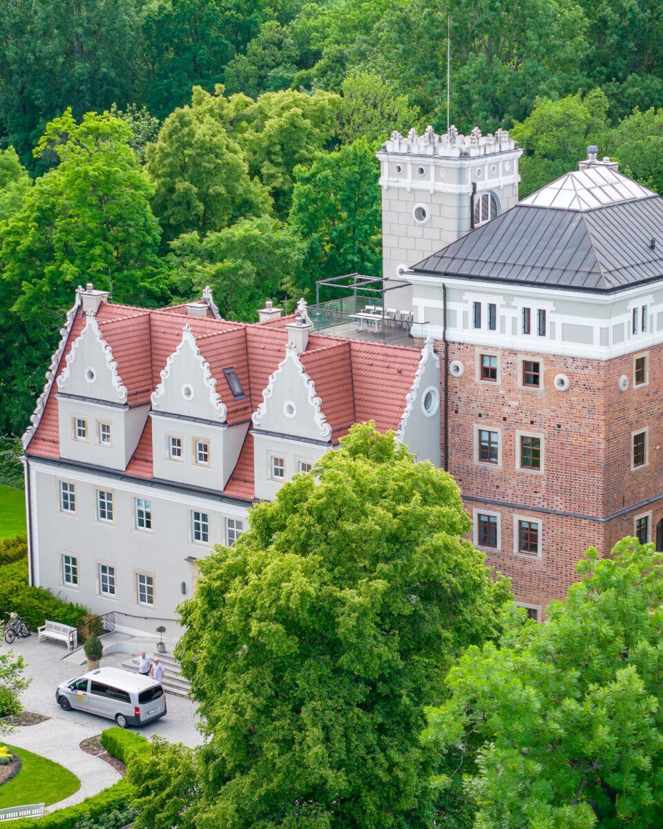 Zamek Topacz to jedna z najpiękniejszych neogotyckich rezydencji na Dolnym Śląsku, położona we wsi Ślęza, zaledwie kilkanaście kilometrów od Wrocławia. Romantyczna budowla wznosi się nad malowniczymi stawami, otoczona parkiem krajobrazowym, z widokiem na tajemniczą górę Ślężę - świętą górę starożytnych Słowian. To miejsce, gdzie historia, przyroda i architektura tworzą niezapomnianą kompozycję.